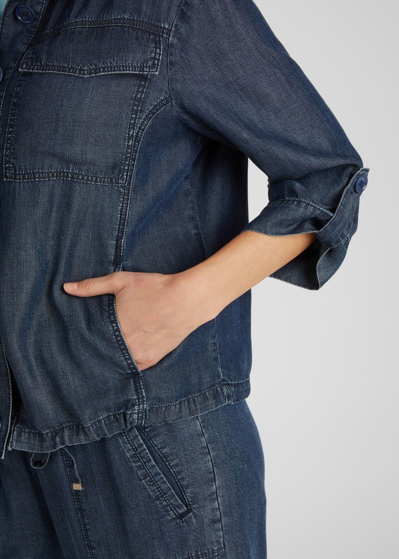 Модная куртка на пуговицах с рукавами 3/4 в джинсовом стиле и рубашечным воротником - абсолютный must-have для каждой женщины, следящей за трендами! Широкая форма обеспечивает удобную посадку, а кулиска на кромке позволяет регулировать куртку индивидуально. Куртка имеет практичные боковые карманы и стильные нагрудные карманы.