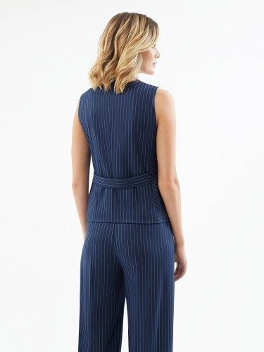 Прямой чуть приталенный жилет из костюмной ткани с добавлением вискозы в темно-синем цвете с тонкой вертикальной полосой белого цвета. Жилет с V-образным вырезом на пуговицах и декоративным элементом на спинке. В жилете имеются прорезные карманы с листочками. Идеально впишется в офисный образ с жакетом и брюками из этой же ткани. Стиль smart casual.