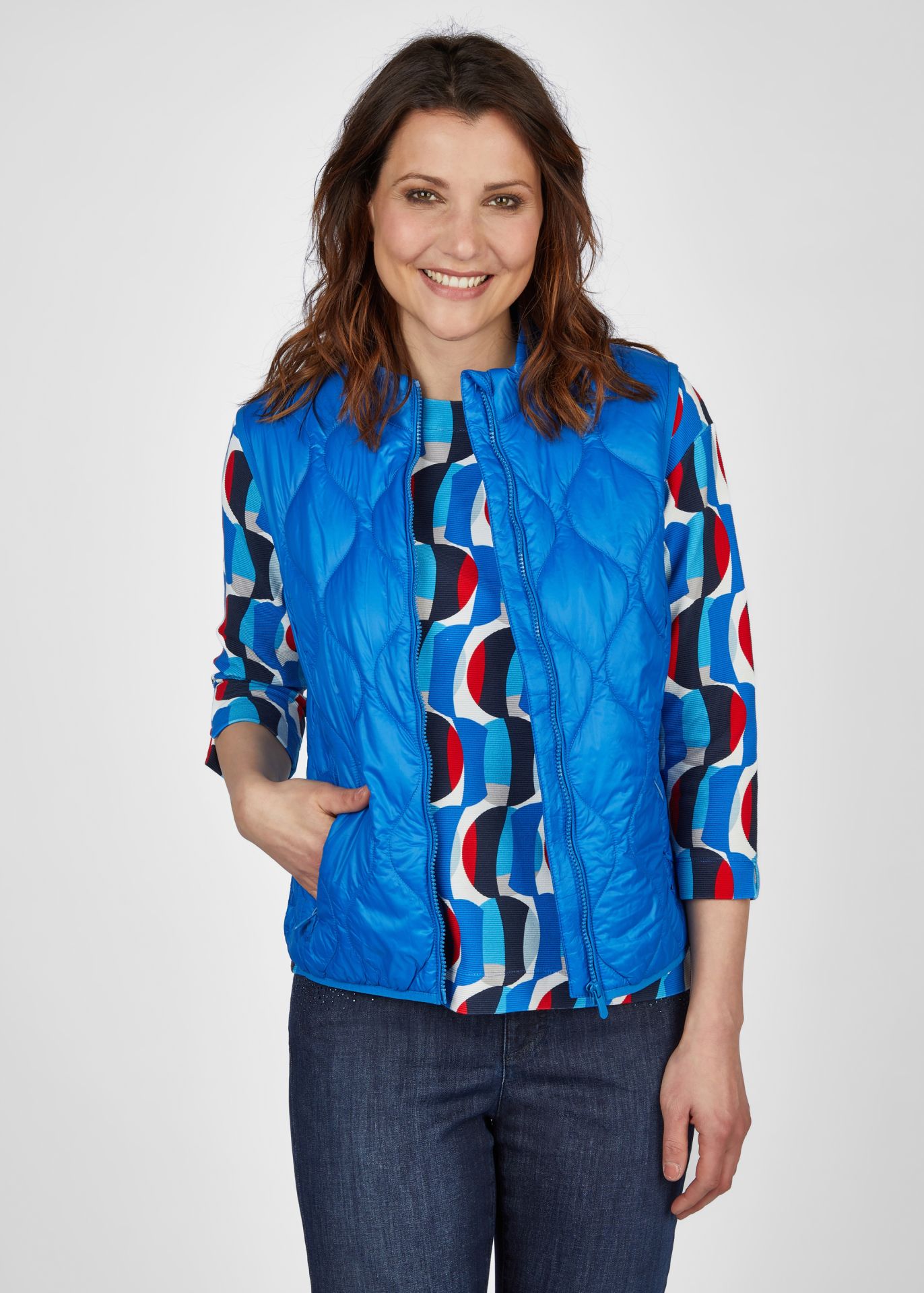 Жилет впечатляет простым однотонным дизайном и современным воротником-стойкой, который защитит от ветра и холода. Практичная молния позволяет легко надевать и снимать сумку, а карманы на молнии сохранят ваши ценные вещи в безопасности. Легкий и дышащий материал обеспечивает оптимальный комфорт в любой ситуации. Этот стеганый жилет можно носить как дополнительный слой под курткой или отдельно поверх блузки. Длина спинки от плеча для 44 размера: 64см.
