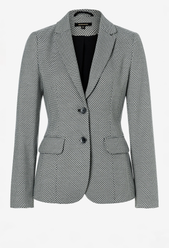 Женственный строгий деловой пиджак с графическим мини-узором черного/бежевого/бежевого цвета. Строгий однобортный костюм. Воротник с лацканами. Карманы с клапанами. Длинный рукав. Длина по размеру 42 - 62 см.
