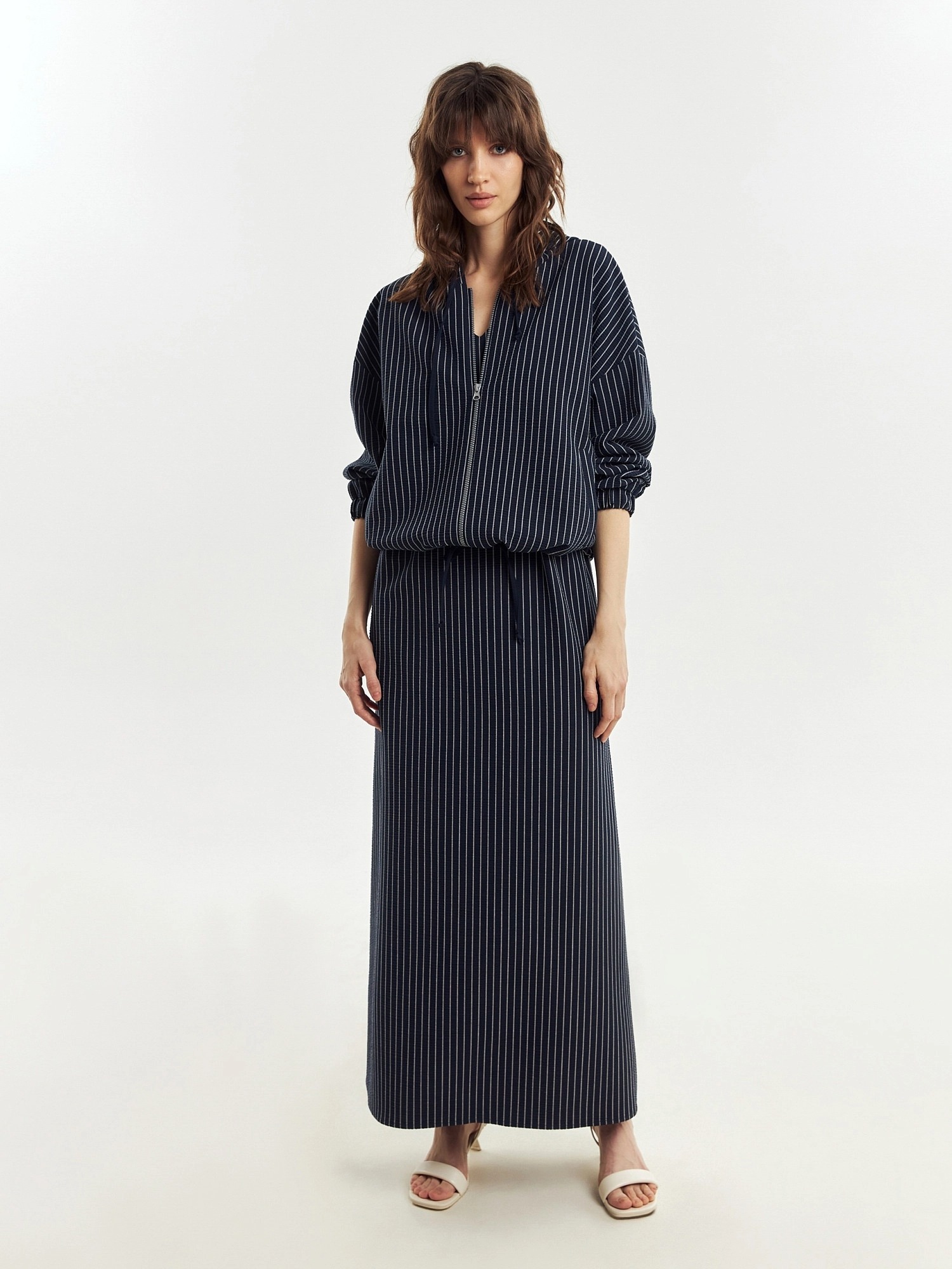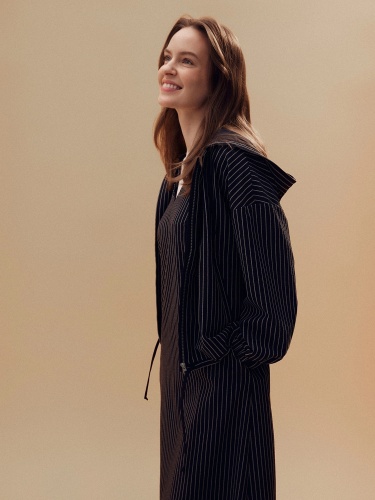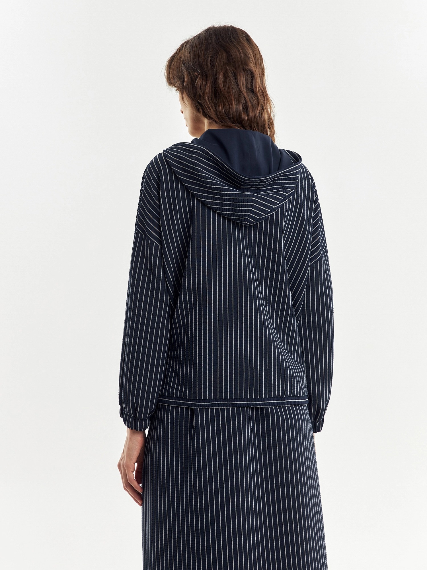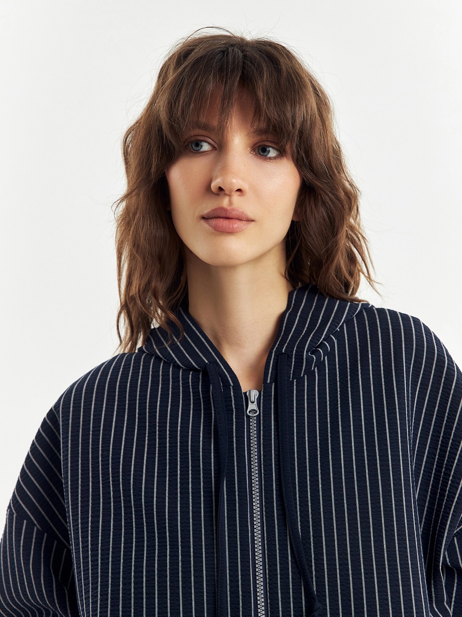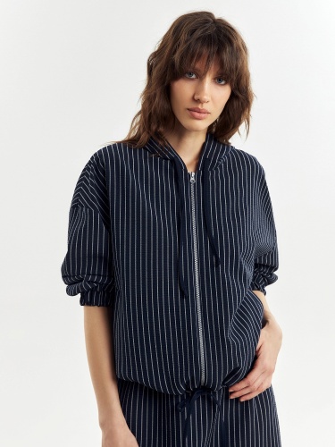 Жакет из фактурной вискозной ткани в тонкую молочную полоску с капюшоном на тракторной молнии. Рубашечный рукав на широкой манжете. Прорезные карманы листочки. Низ бомбера на кулиске.