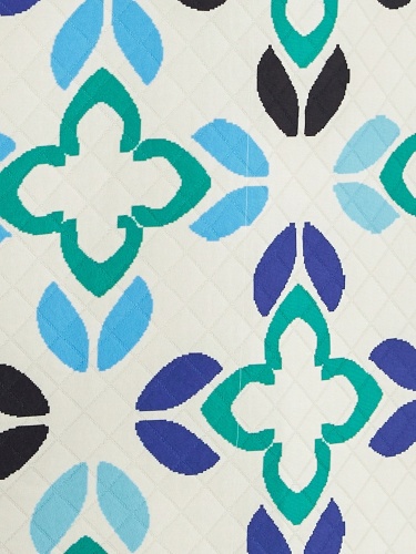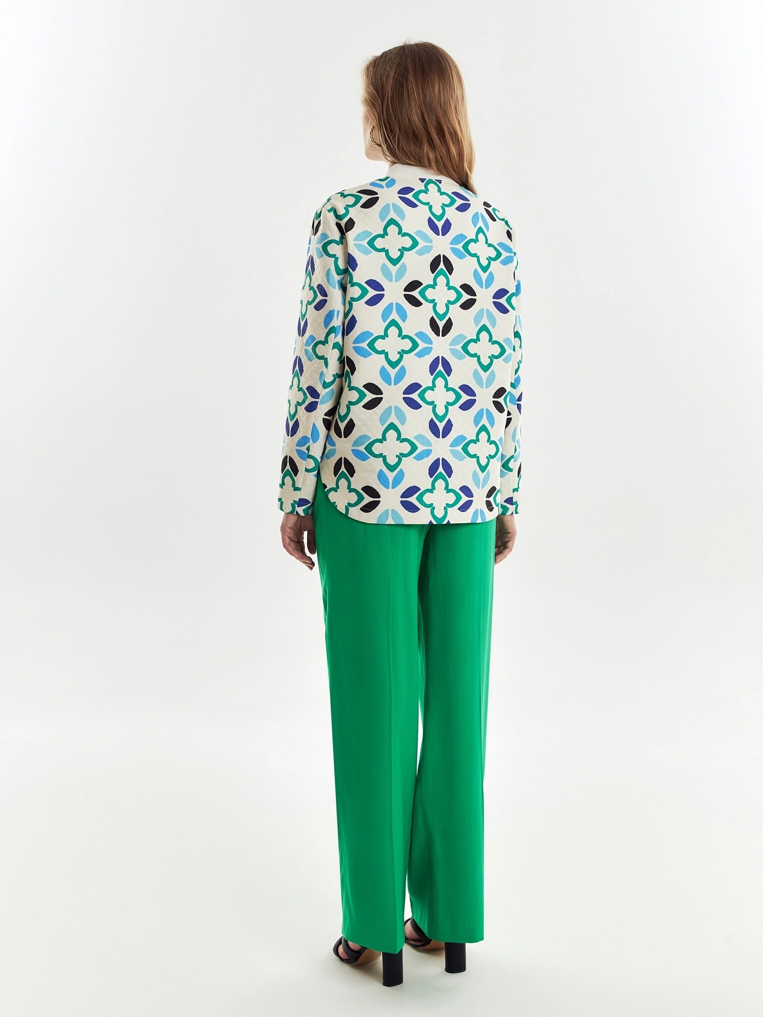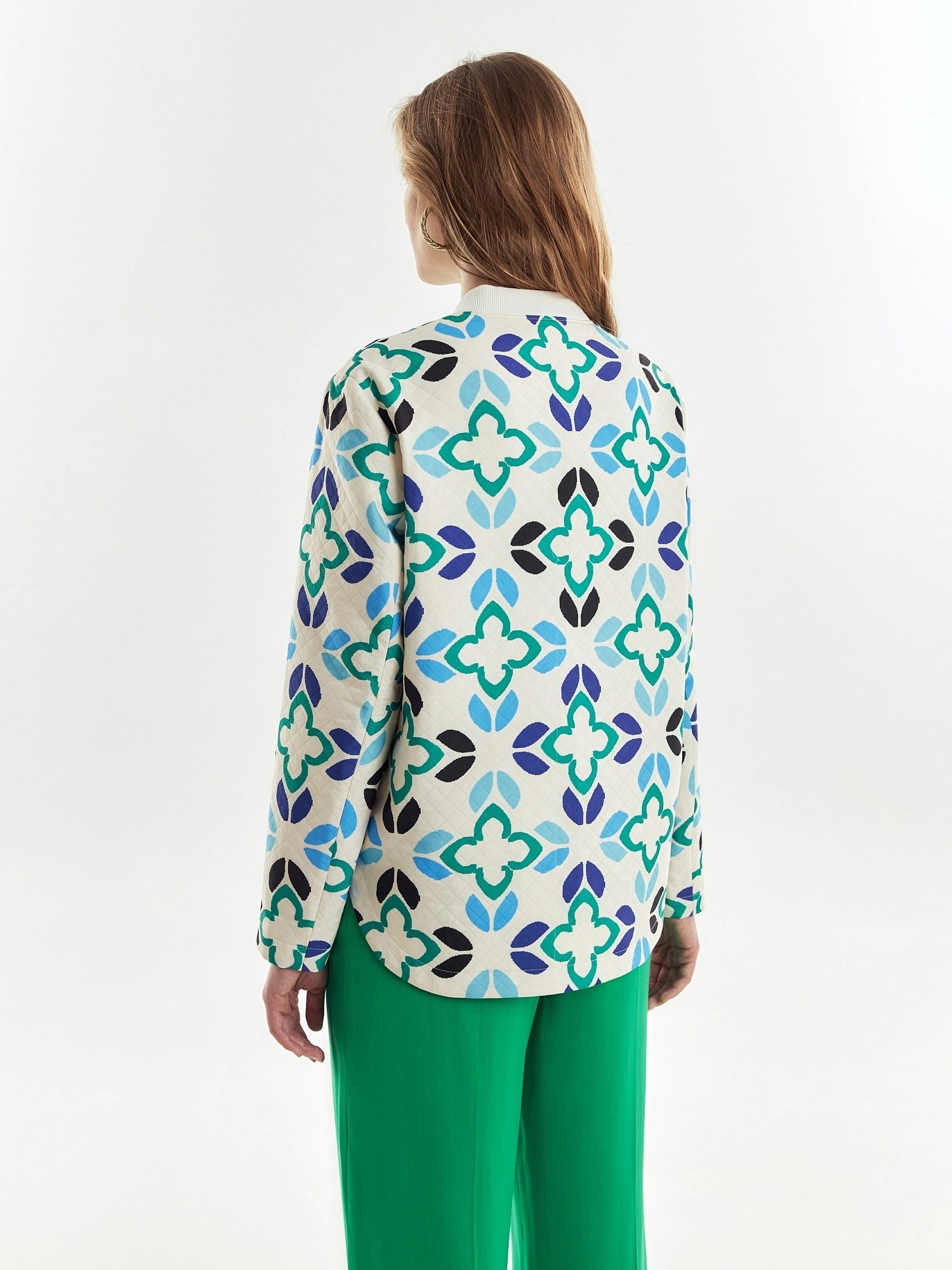 Жакет на молнии в принтованной ткани с лазерной стежкой с воротником-стойкой из кошкорсе. Жакет со спущенным плечом и прорезными карманами-листочками по борту. Длина переда и спинки на разном уровне.