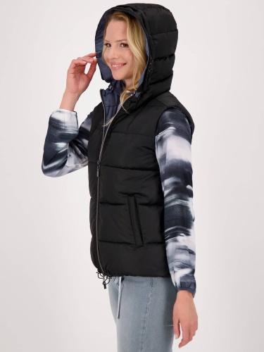 Cтеганый жилет черного цвета – теплый и стильный элемент аутфита. Подойдет для образов в спортивном или повседневном стиле, а также для образов спорт-шик. Застежка на молнию и клепки. Объемный капюшон защищает от ветра.
