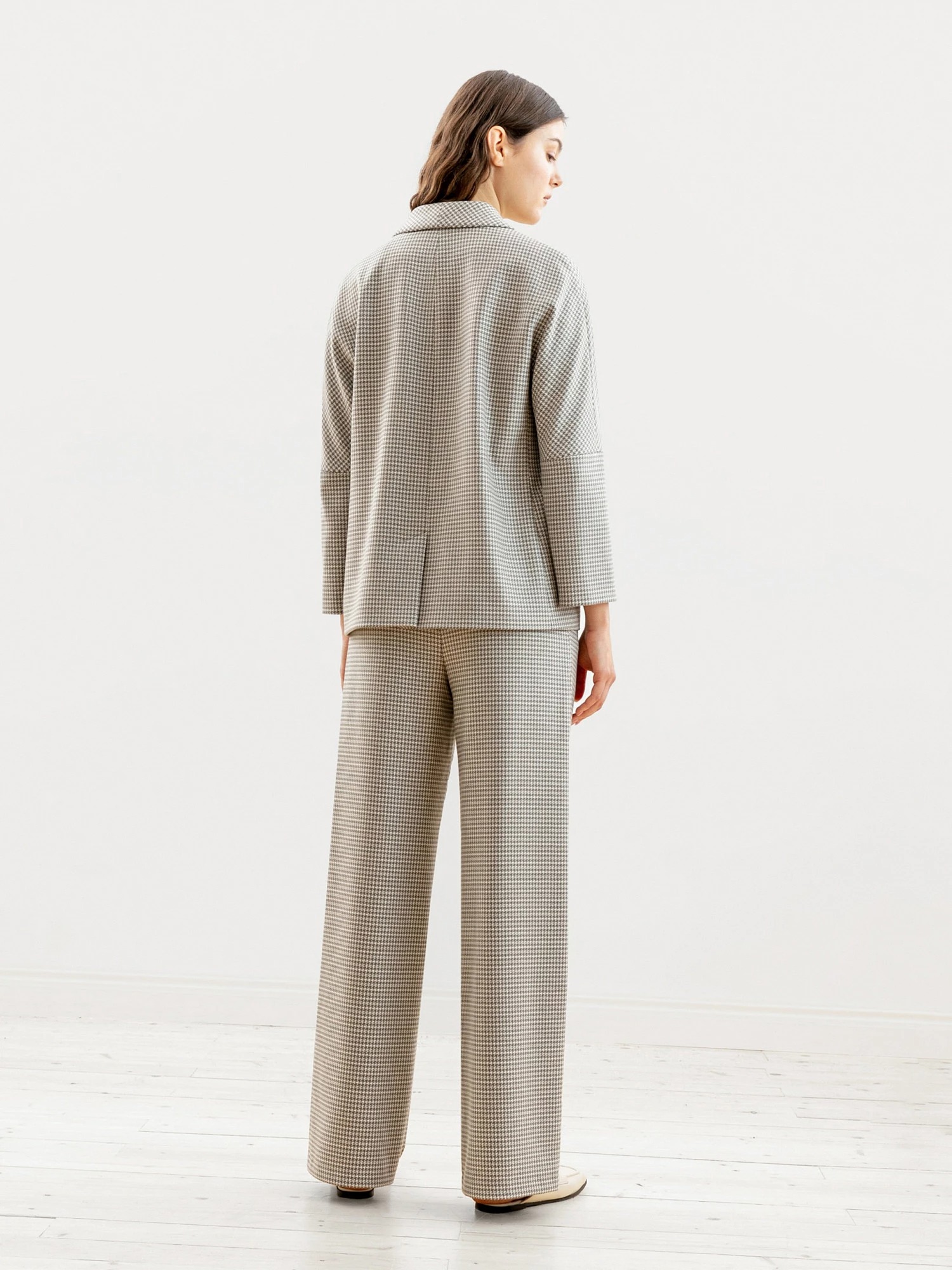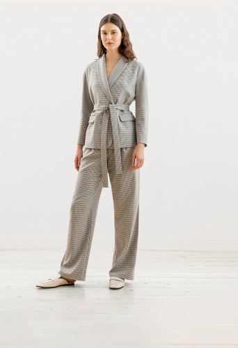 На сайте указаны Российские размеры Прямой удлиненный жакет на подкладке изготовлен из костюмной ткани с принтом пье-де-пуль ("гусиная лапка"). Рукав кимоно и воротник шалька добавят расслабленности вашему офисному дресс-коду. В комплект входит пояс из основной ткани для создания более приталенного силуэта. Рост модели на фото - 175 см.