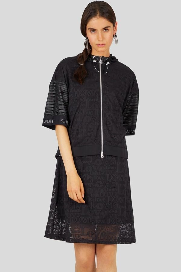На сайте указаны Российские размеры. Жакет с короткими рукавами и капюшоном. Спереди имеются карманы. Молнии встроены в боковой шов, что позволяет варьировать ширину подола. Спину украшает благородный металлический переводной принт с логотипом Sportalm. Подол удлинен и слегка закруглен сзади.