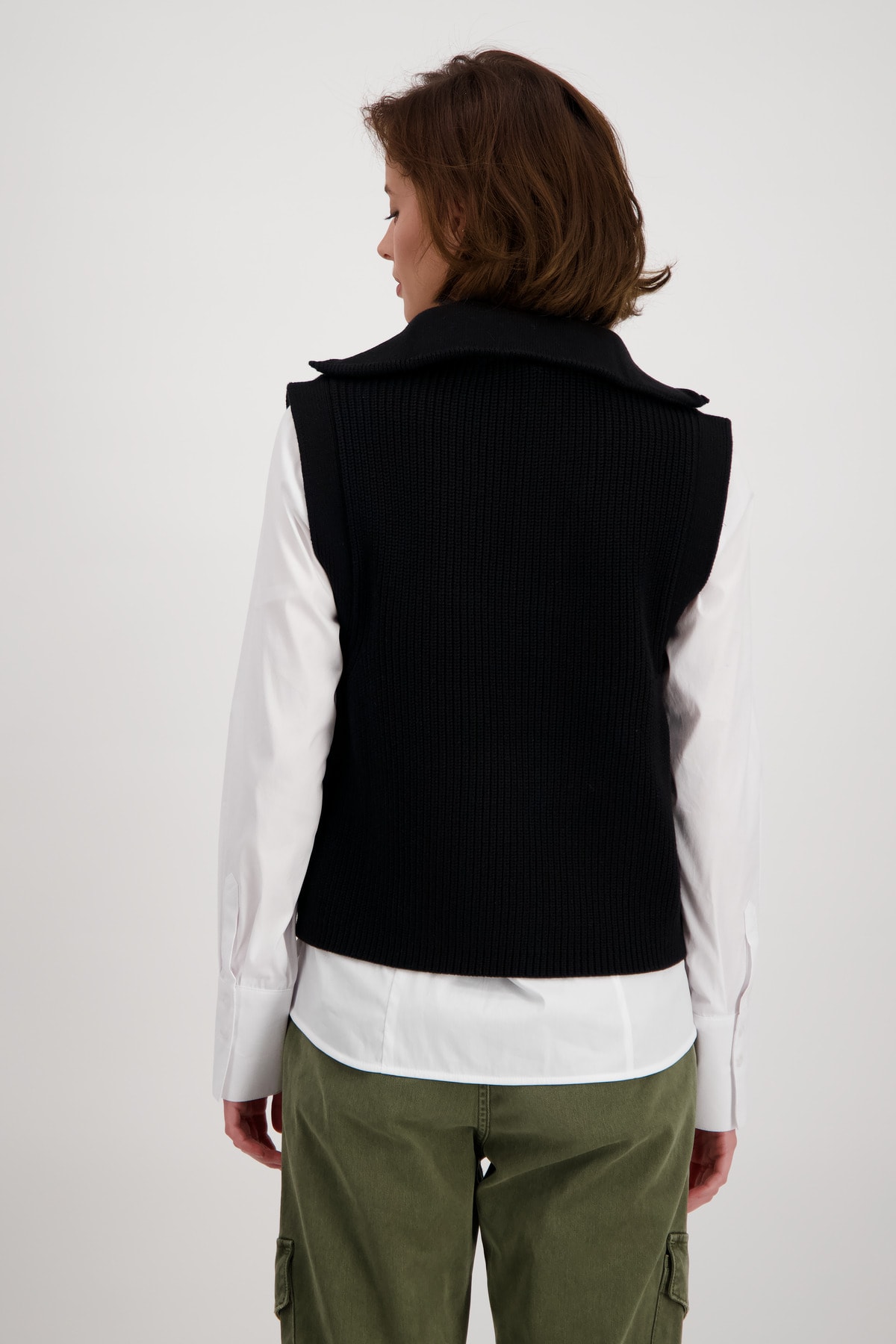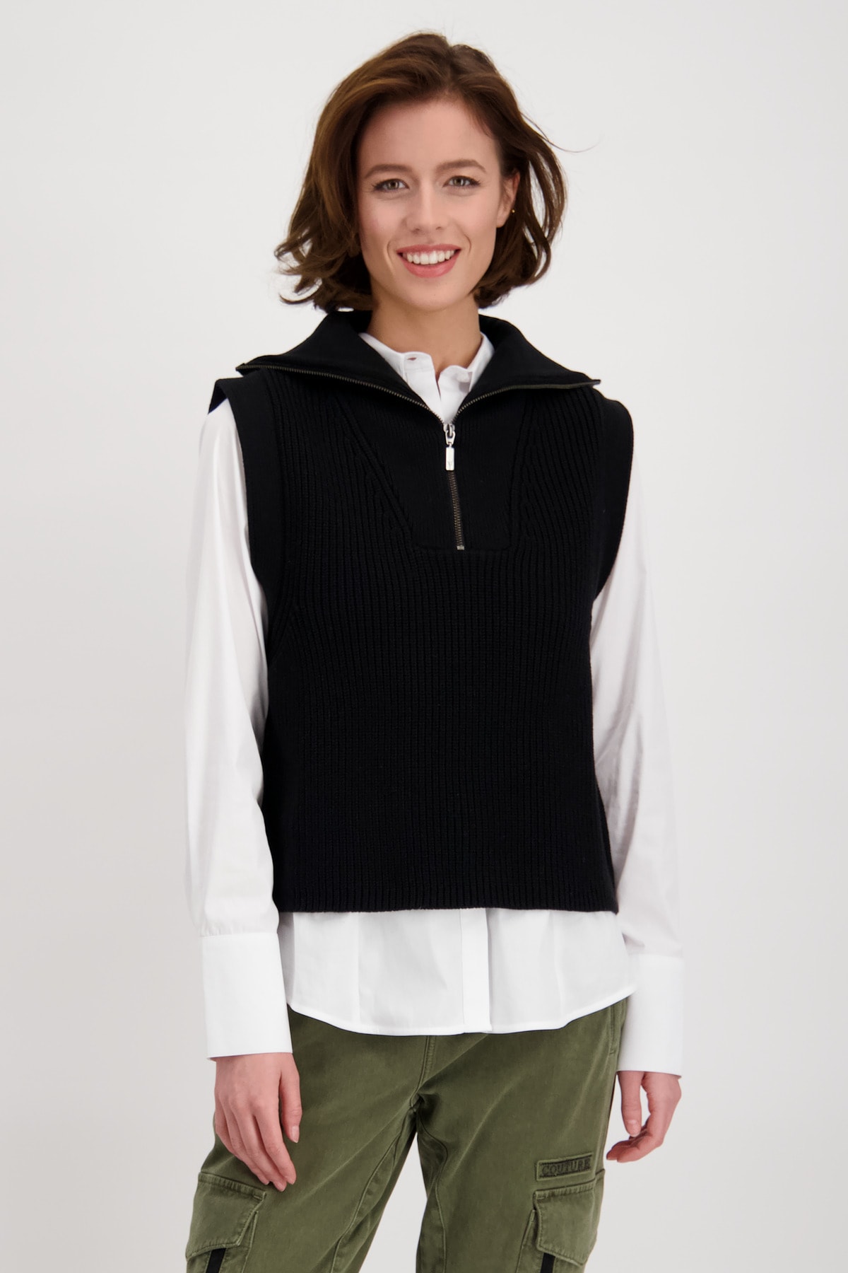 На сайте указаны российские размеры. Трикотажный жилет с тройным воротником и молнией. Модель прямого кроя с застежкой-молнией на воротнике Troyer и вязаной манжетой на ложных концах рукавов. Модель без рукавов представляет собой женственную структуру Perlfang и обещает удобную посадку благодаря производству высококачественного хлопка, смешанного с полиакрилом. Модель ростом 178 см.