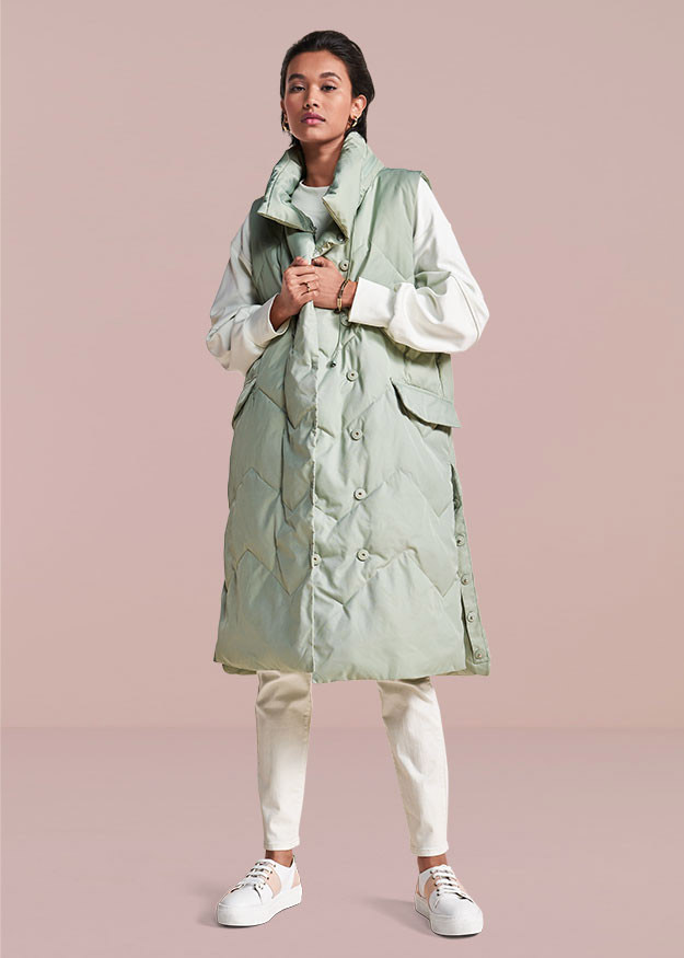 Модный спортивный жилет оверсайз с большим воротником-стойкой и ультрасовременной стеганой отделкой впечатляет не только своей длиной, но и легкой технологичной отделкой, которую удобно носить. Практичные боковые разрезы, которые можно открыть внизу, обеспечивают свободу движений, и капюшон, спрятанный в воротнике.