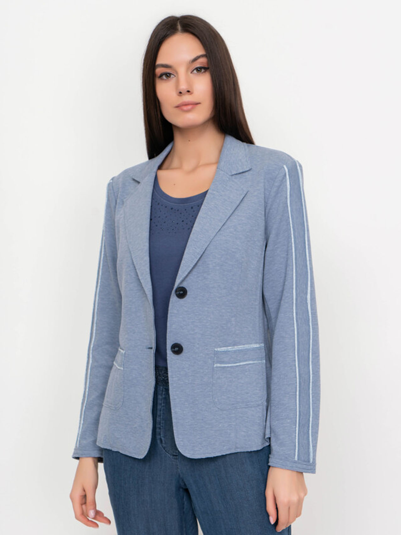 Жакет с лацканами. Застежка на пуговицах. Накладные карманы. Отделка на рукавах и карманах. Базовая модель в нейтральном цвете. Длина изделия по спинке: 60 см.