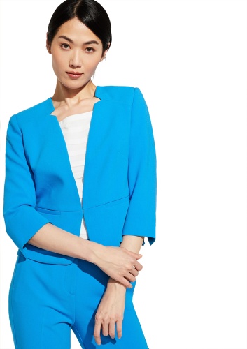 Однотонный яркий жакет с фигурным вырезом. Втачной рукав длины 3/4 с разрезами. Материал из смесовой вискозы приятен к телу и обеспечивает комфорт ношения.