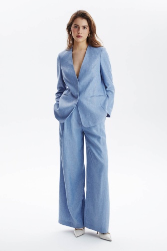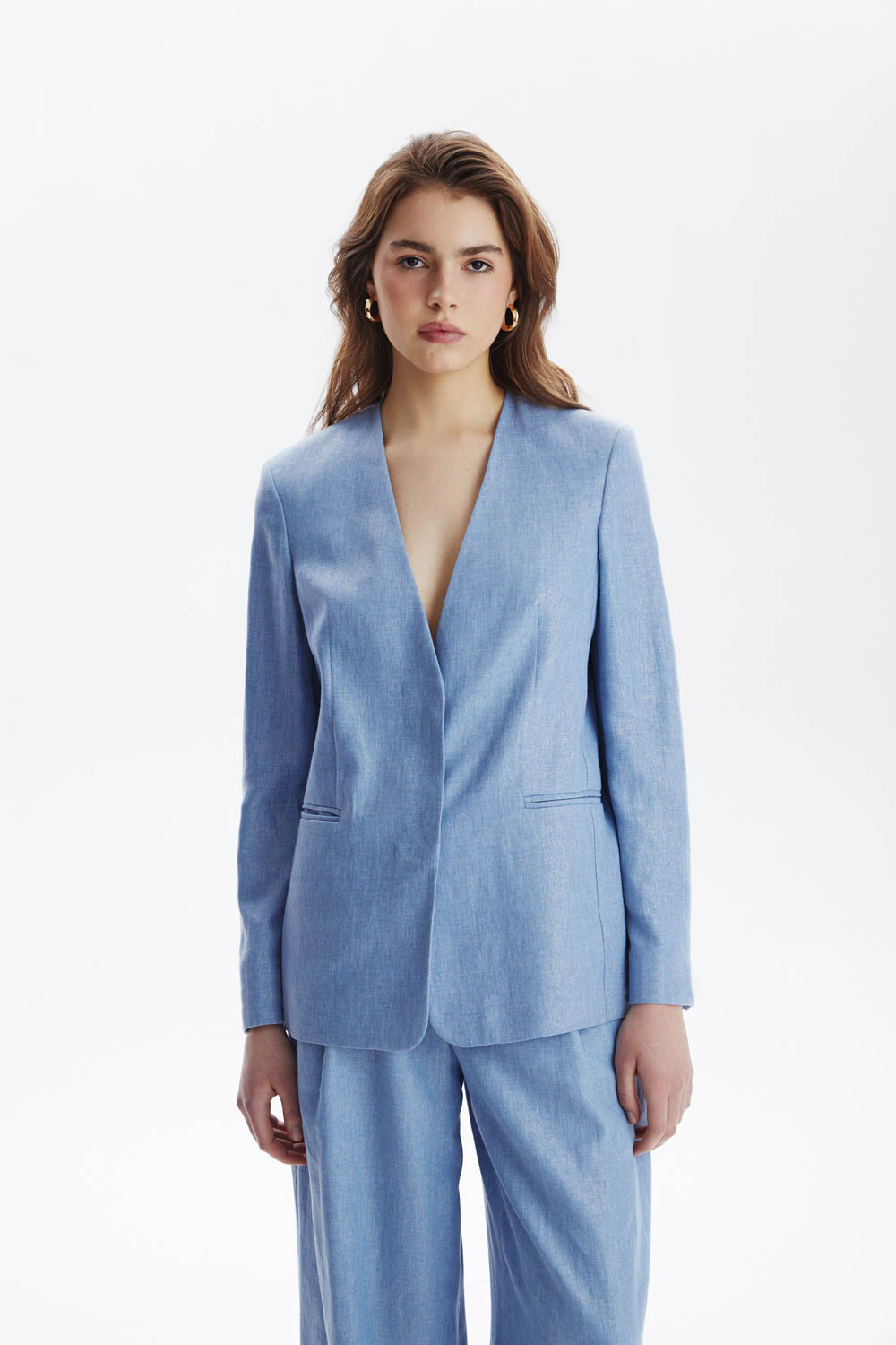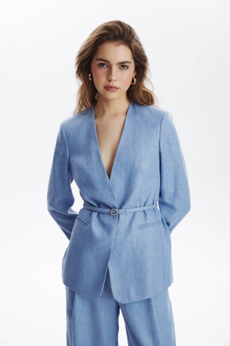 Жакет выполнен в изящном светло-голубом оттенке, который придает образу свежесть и лёгкость. Модель отличается лаконичным и современным кроем с глубоким V-образным вырезом, создающим элегантный и утончённый силуэт. Этот жакет станет прекрасным дополнением как к деловому, так и к повседневному стилю, подчеркивая индивидуальность и хороший вкус.