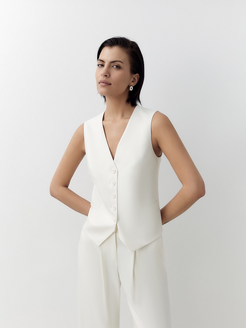 Прямой жилет с V-образным вырезом и листочками. Жилет выполнен из костюмной ткани молочного цвета.