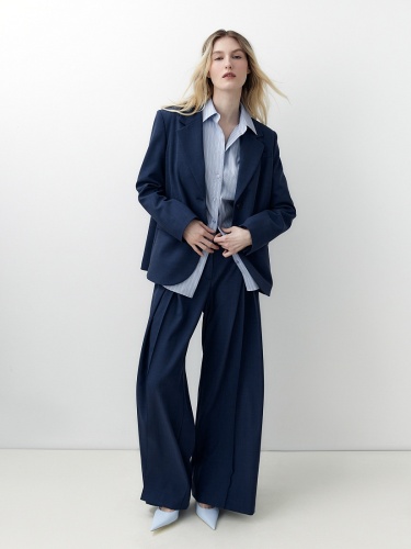 Удлиненный прямой однобортный жакет с V-образным вырезом и английским воротником. Жакет на двух пуговицах с прорезными карманами и клапанами, на спинке шлица.