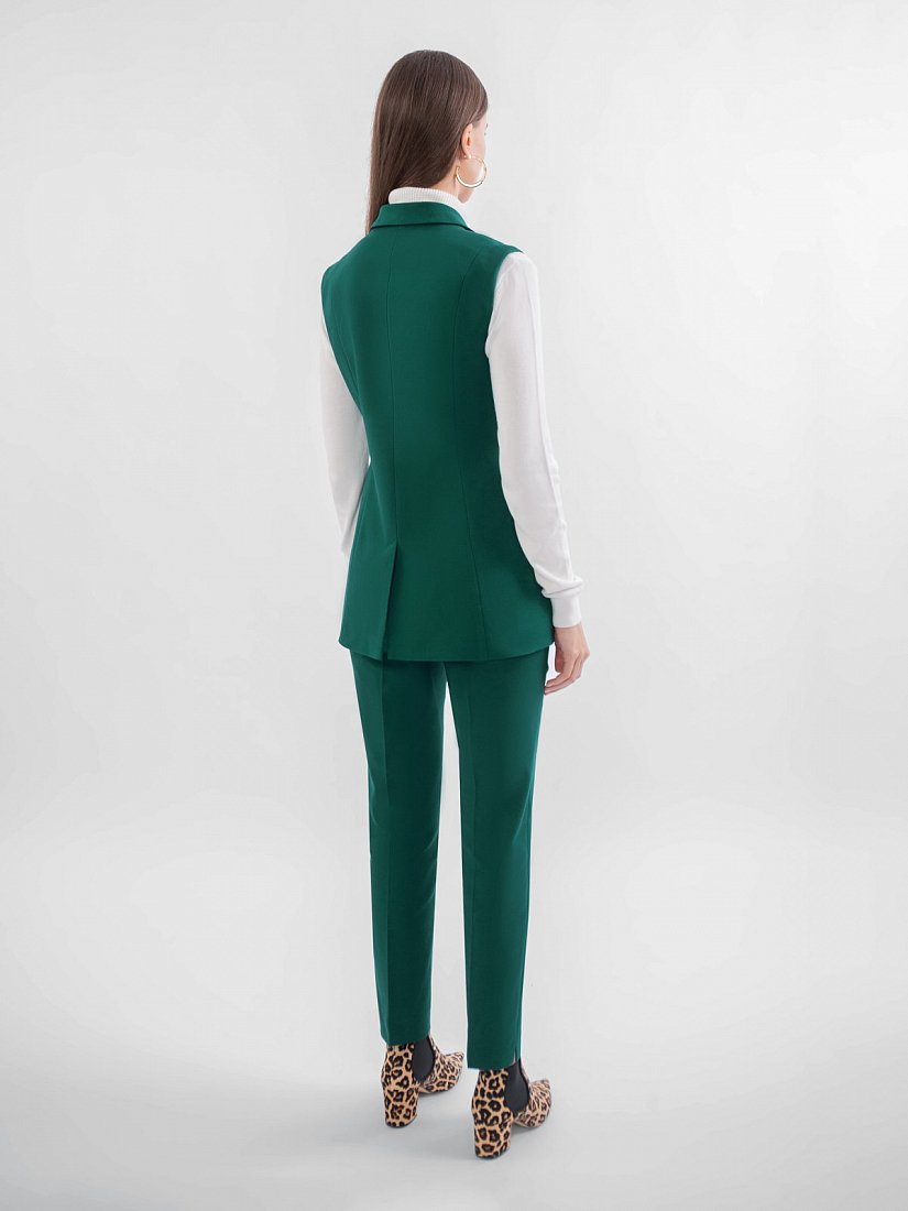 Жилет из костюмной ткани на подкладке полуприлегающего силуэта с v-образным вырезом, английским воротником и застежкой спереди на пуговицу. Спереди рельефы и карманы листочки. Сзади шлица.