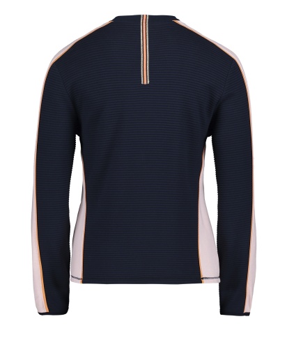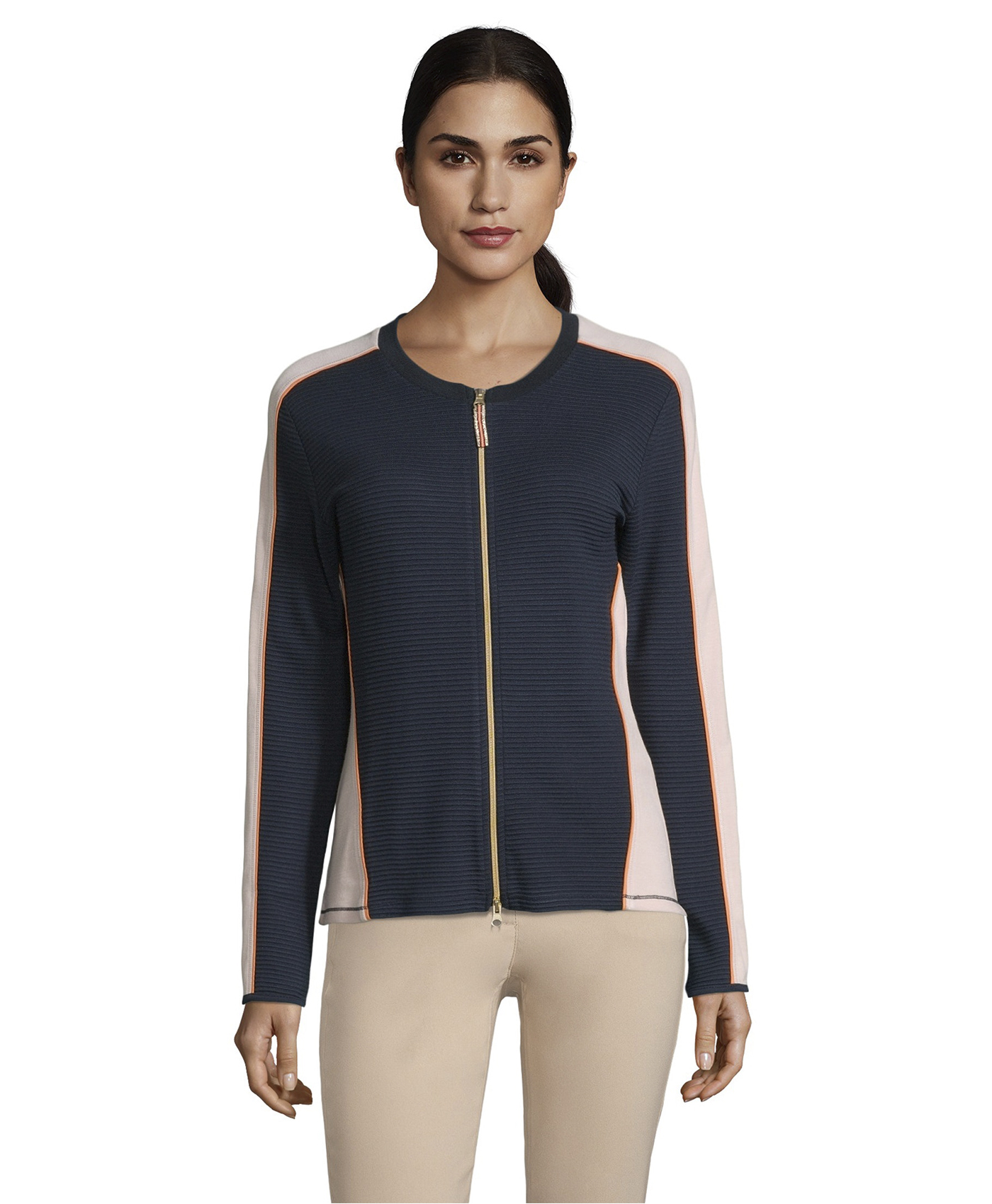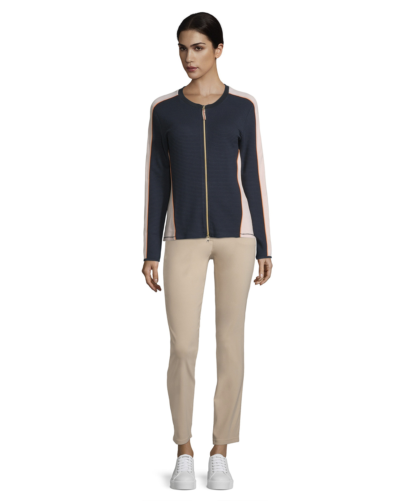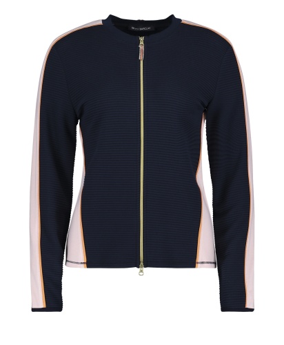 Стильный блейзер слегка приталенного силуэта. Круглый вырез горловины, длинные рукава, застежка-молния. Материал из вискозной смеси приятен к телу и обеспечивает комфорт. Сочетание контрастных цветов визуально делает силуэт более изящным. Этот блейзер - модный выбор для прогулки прохладным летним вечером.